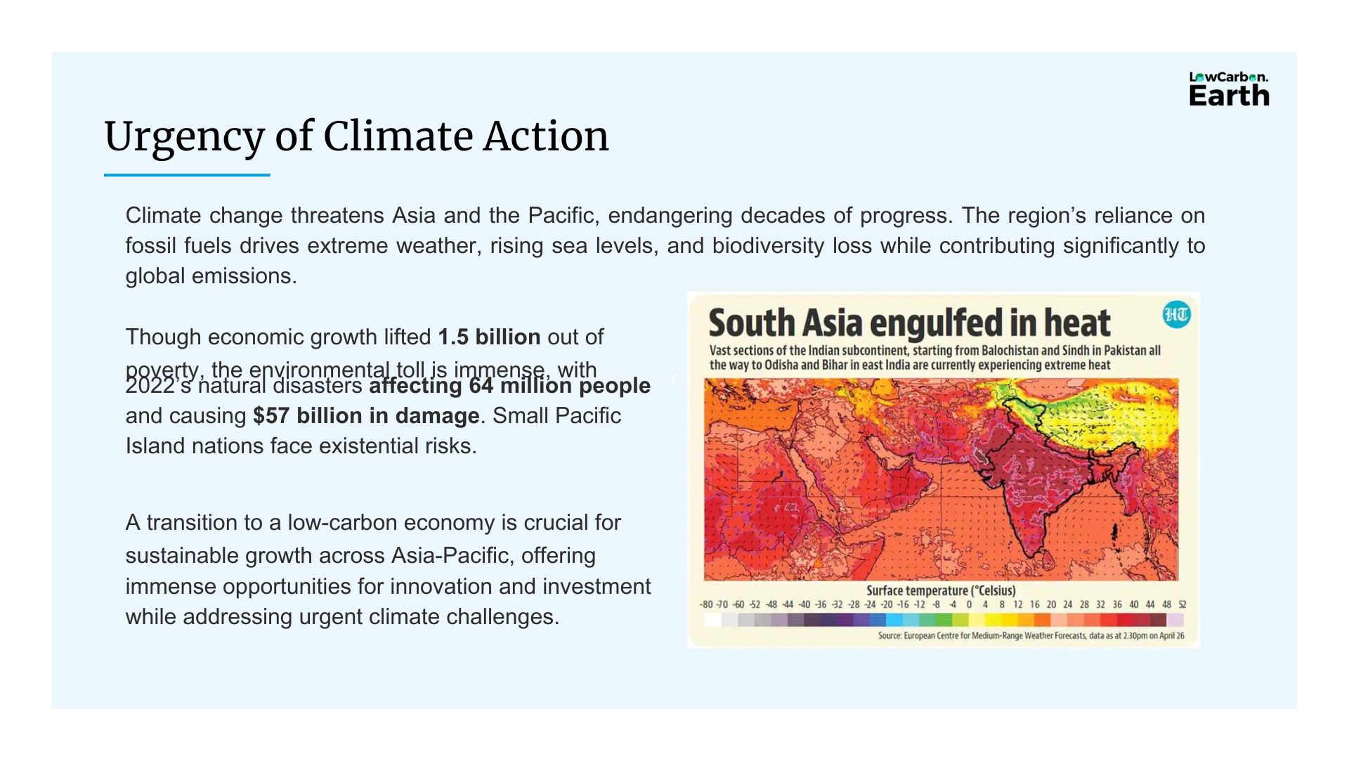 亞太地區高度依賴化石燃料,導致極端氣候、海平面上升與生態系統崩解。2022 年自然災害影響人數高達 6,400 萬,造成逾 570 億美元損失。小島國更面臨生存危機,低碳轉型已成為區域永續發展的關鍵。