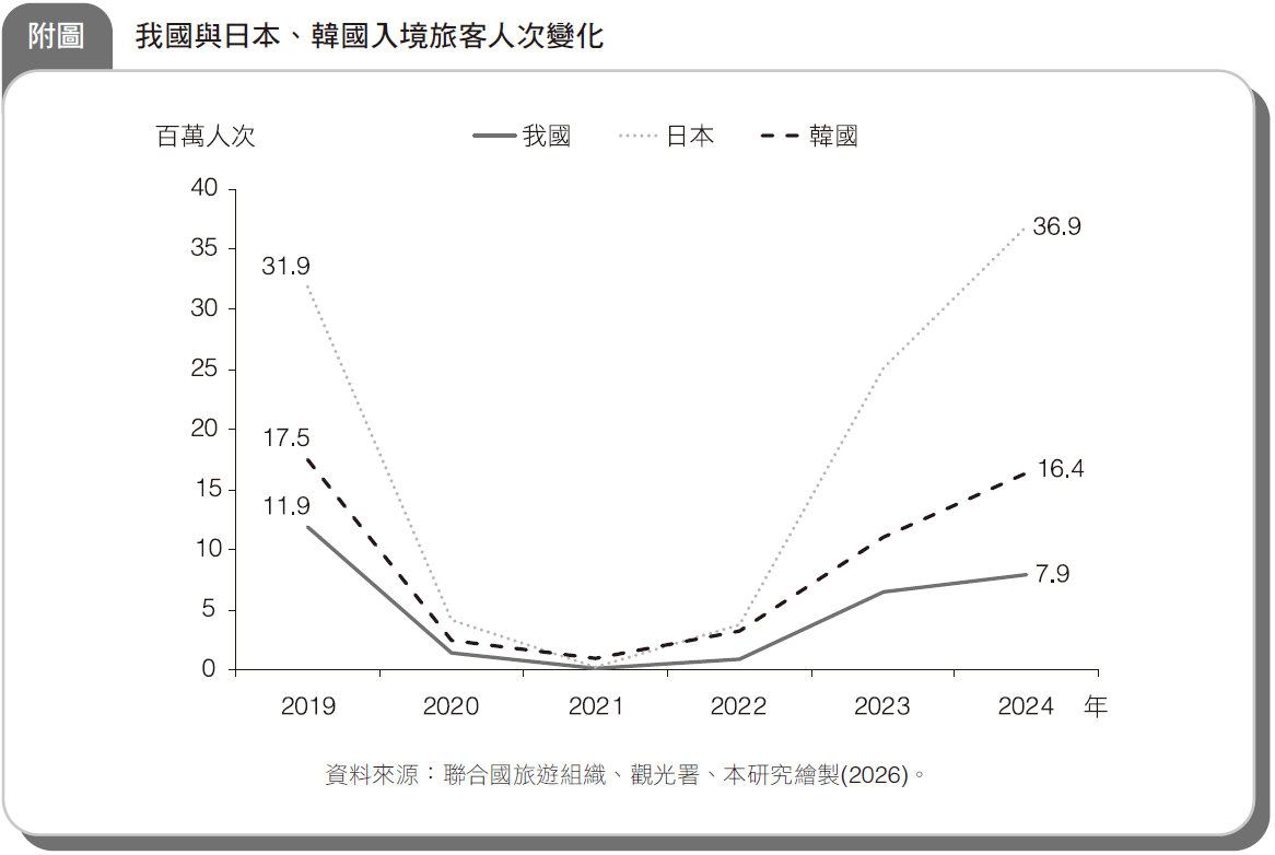 疫後全球旅遊市場快速回溫,據聯合國旅遊組織(UN Tourism)統計,2024年全球國際旅客達14.68億人次,已幾乎恢復至2019年14.69億人次的水準,顯示跨境旅遊需求強勁且持續成長。然而,相較於日韓等亞洲主要旅遊國家,我國復甦力道相對有限,2024年入境旅客786萬人次,僅為2019年1,186萬人次的66%(附圖)。