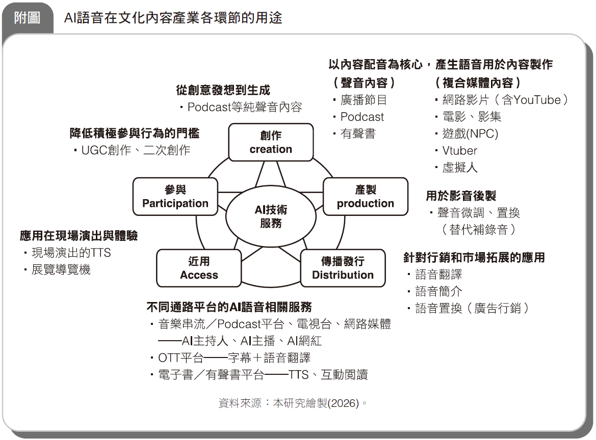 生成式AI語音應用正使文化內容產業發生質變,從IP聲音一致性、全球在地化配音到跨語言轉譯,開啟低成本擴散與長尾效益的新機會。然而,新型態授權、市場價值區隔、應用倫理等議題亦隨之浮現,牽動配音員勞動權益與品牌信任。觀察語音資料庫涉及數位主權與文化認同,惟有兼顧技術創新、制度規範與在地語音建構,方能在產業升級與文化平權間取得平衡。