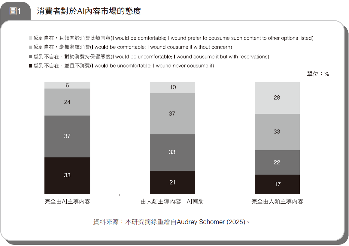 首先從AI內容的市場接受程度來看,Audrey Schomer (2025)根據管理顧問公司Baringa於2025年1月針對來自美國、英國、澳洲、荷蘭與德國等5,004名受訪者的調查結果所提出的分析報導指出,多數消費者對於「完全由AI主導內容」(70%),以及「由人類主導內容,AI輔助」(54%)感到不自在,且有約1/3的消費者對於「完全由AI主導內容」抱持完全不消費的態度(圖1)。