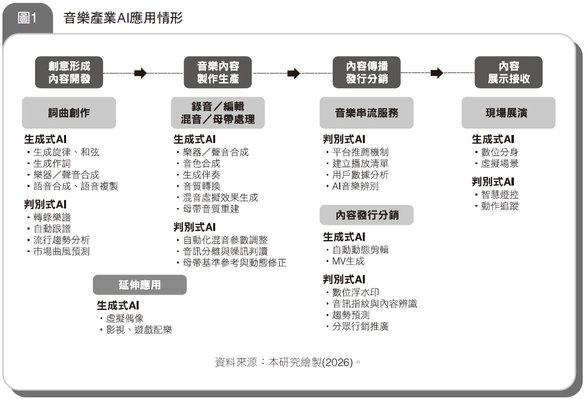 內容傳播與發行分銷環節,判別式AI應用於串流平台推薦機制、用戶行為分析及AI音樂辨別;生成式AI則應用於自動動態剪輯與MV生成等產製視覺內容。展示接收端,生成式AI則應用在現場演出的數位分身與虛擬場景等環節,藉此突破實體演出空間限制,提供消費者不同的現場體驗感;判別式AI則應用於智慧燈控與動作追蹤等硬體系統之中(圖1)。