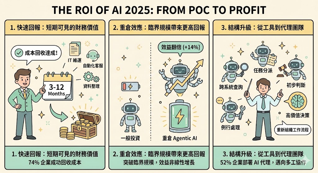 The ROI of AI 2025、投資回本週期、Agentic AI部署、多AI代理編排、流程重設、資料治理成熟度、客服自動化、IT維運自動化、行銷投放優化、資安異常偵測