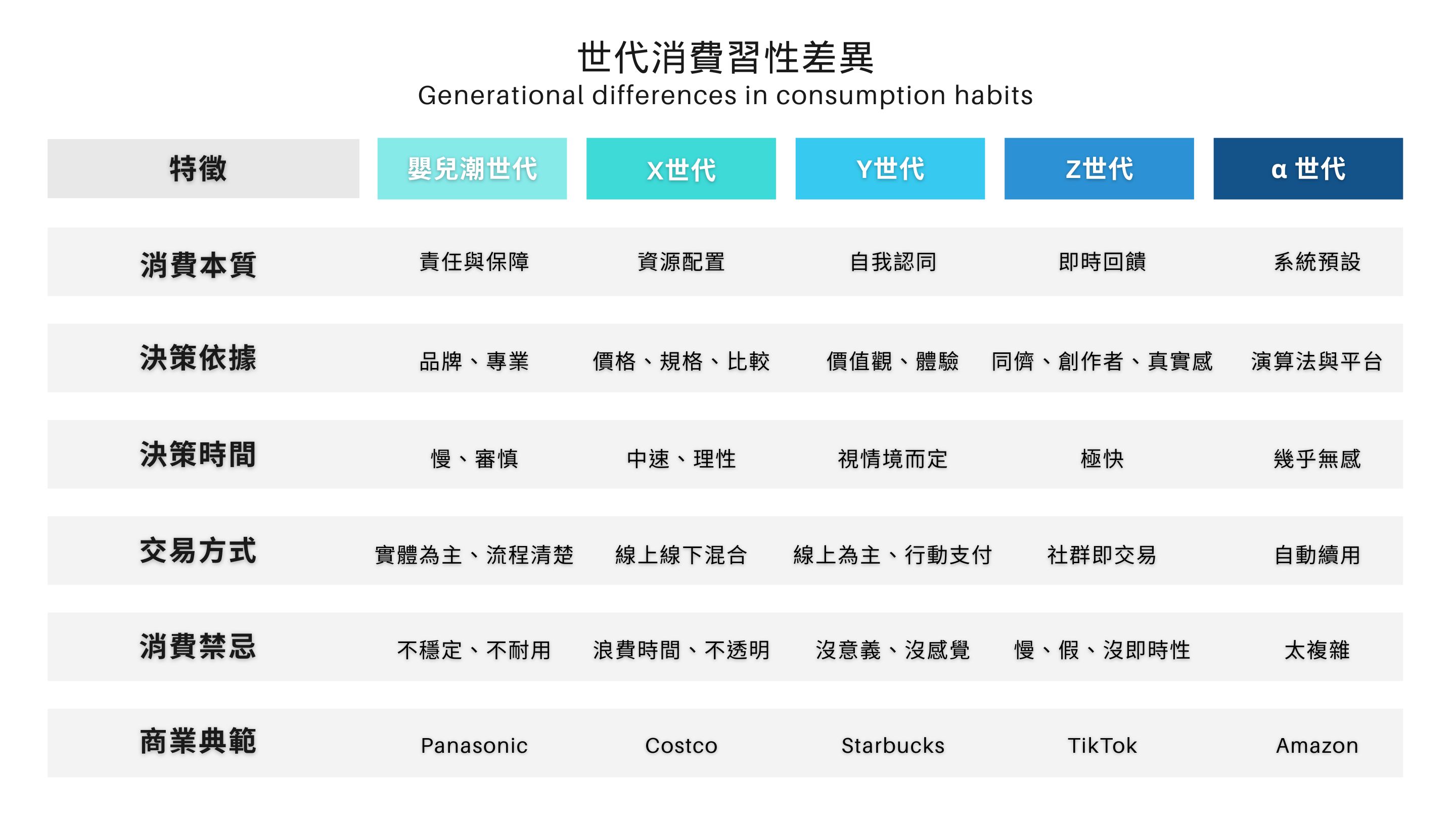 📌 世代消費決策邏輯不同 市場存在多種消費邏輯,從風險控管、效率計算,到即時回饋與系統預設,世代差異即是決策差異。