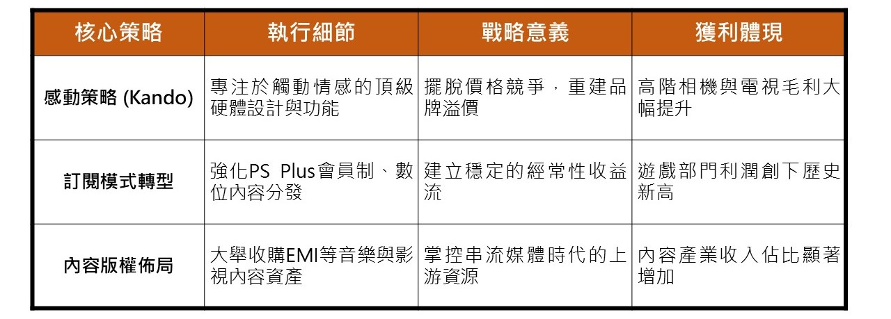 當SONY解決了生存問題後,平井一夫開始思考企業的長遠存在意義。他提出的第三個關鍵想法是「感動」(Kando)策略。這聽起來像是一個虛幻的感性詞彙,但在平井一夫的執行下,它轉化為一套極其理性的獲利模式轉型,成功讓索尼從傳統的硬體販賣者,轉變為提供持續性價值的服務者。